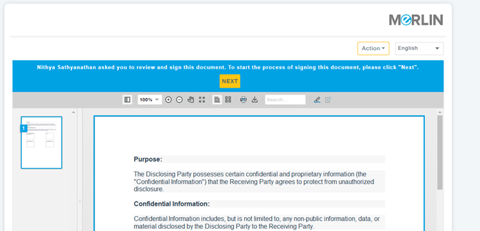 Once the document has been finalized by the buyer, he could ask for a signature on the document. In such cases, MeRLIN will let you provide a signature on the document provided to you.