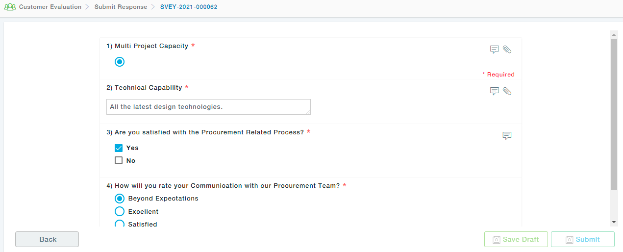 Wherever the Message Icon (for Comments) and the Attachment icon (for uploading documents) appears, provide the necessary comments in the Comment section and attach relevant documents to be able to Submit the form. These are mandatory sections and only after completing the same, you will be provided with the button to Submit the form.