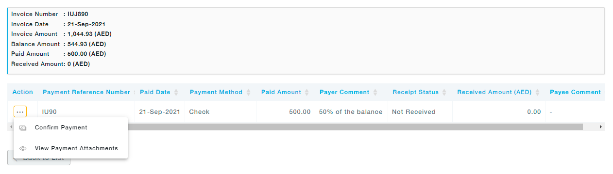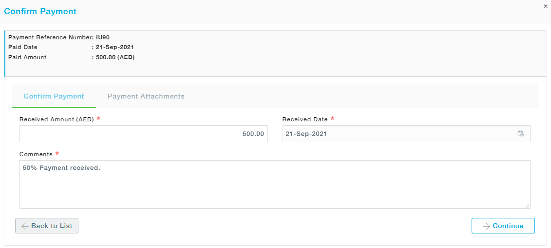 Click on Confirm Payment under the Actions. In the Confirm Payment screen that pops up, received amount is auto populated to the amount paid by the buyer. Choose the received date and Click on the Continue button.