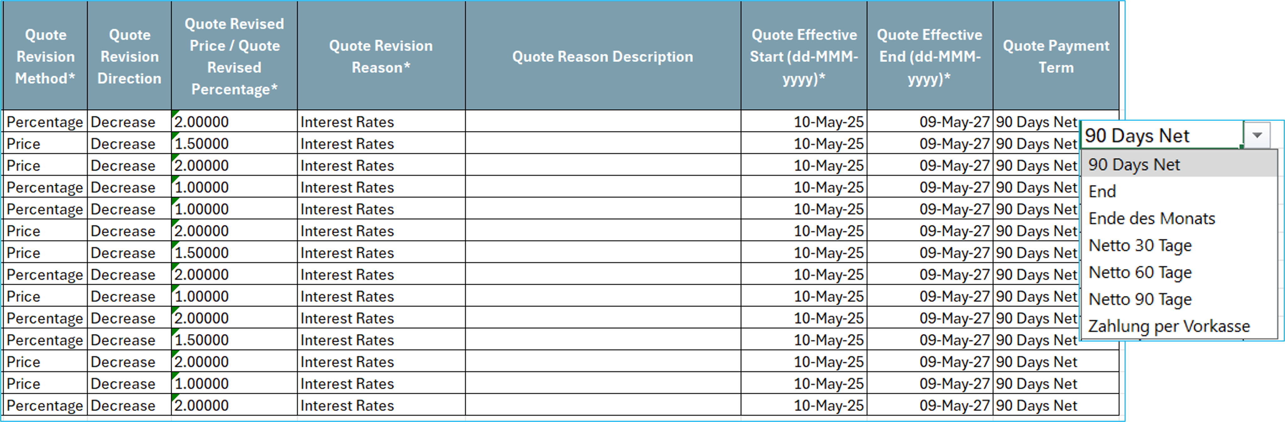 The quote revision method, quote revision direction, quote revision reason and quote payment term are drop down values. Once the details are filled the excel sheet can be uploaded. If there is no change in payment term the column can be left empty.