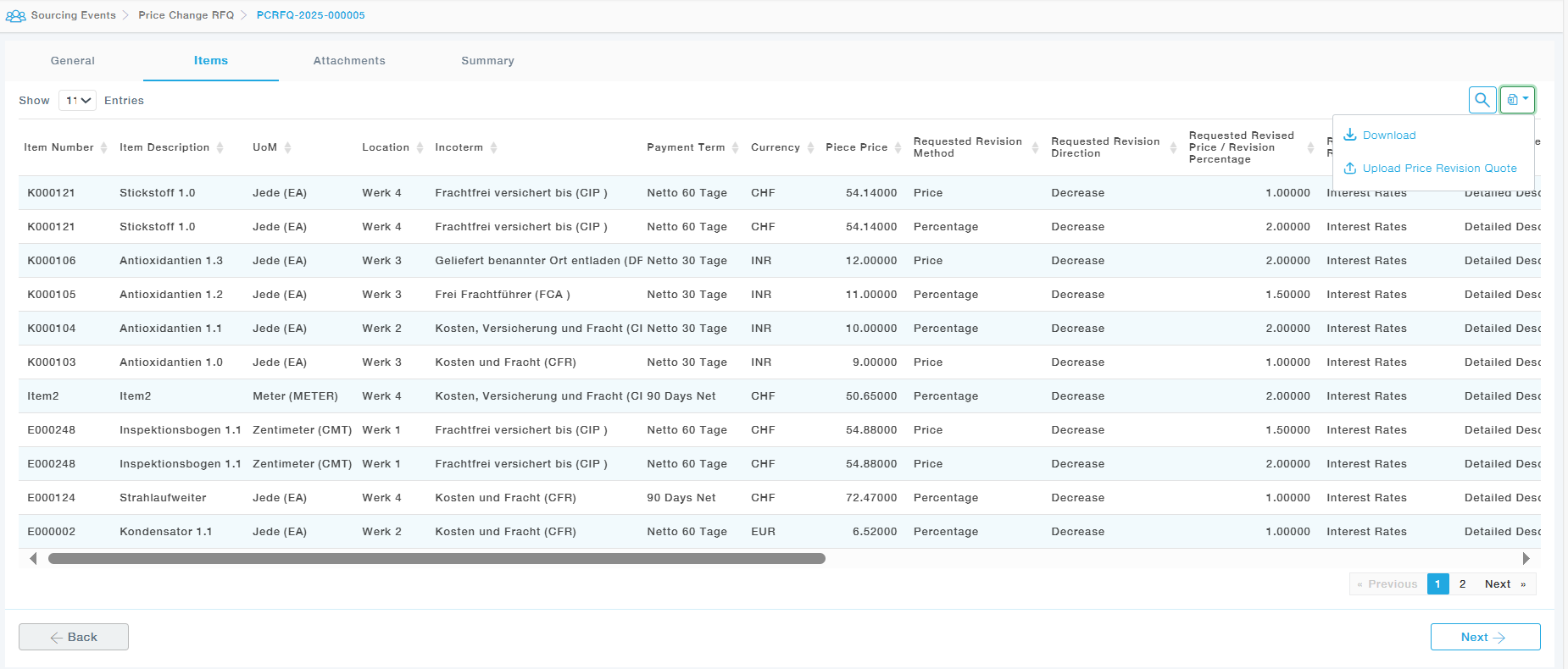 The supplier can choose to view / submit quote. When the supplier selects submit quote, under the Items Tab, the Supplier will be able to find the list of items quoted for the price revision. Using the Download option the supplier will be able to make the quote revision