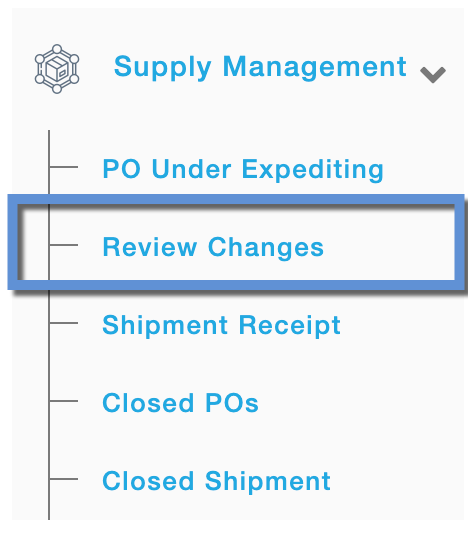 When changes are proposed by the Buyer, such Purchase Orders appear under Review Changes sub-menu of Supply Management menu. Suppliers will have the option to view the details of the changes and accept or reject them.