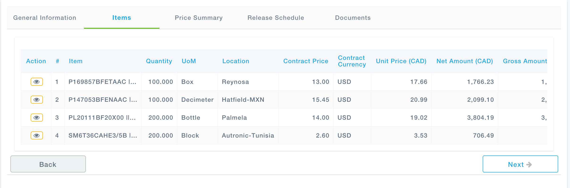 Item Information | Item Description, UoM, Location, Incoterm, Currency and Payment Term as per the active Contract |