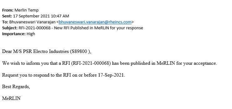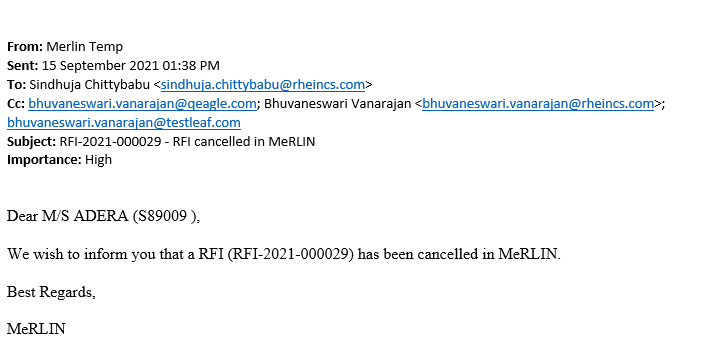 If an RFI is canceled after publishing to Suppliers, all associated Suppliers will be notified of the cancellation. You will receive a notification through email regarding the same. A sample is provided below.