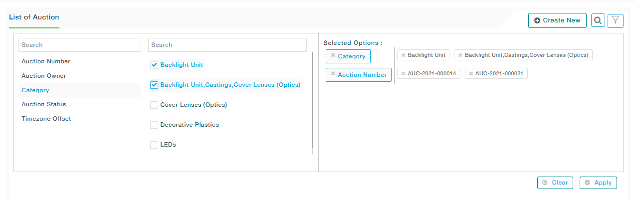 2. Using the advanced filter option in Merlin, one can easily find the Auction based on Auction Number, Category, Supplier Code, Supplier Name, Auction Status, Bid Status, Is Closed- followed by selecting the desired items from the adjacent list. For instance, when the Auction Number is searched, all the Auction Numbers are listed from which one more selection can be made. Similarly, the same procedure can be repeated for other options. A combination of items can also be selected. In such cases, along with items from Auction Number, Status of Auction\Owner of the Auction\Category and\or Time zone Offset can be chosen and then followed by selecting related items from the adjacent list. All the selected Options are then displayed under the Selected Options section. Now click on the Apply button to apply the filter. Click on the cancel button to Cancel the filtering options.