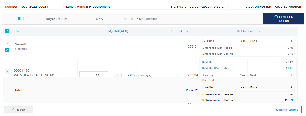 Here you can see the items and their descriptions that are made available by the Buyer for the Auction. You will get to see the Best Bid and other details regarding the auction with fellow competitors in the grid.