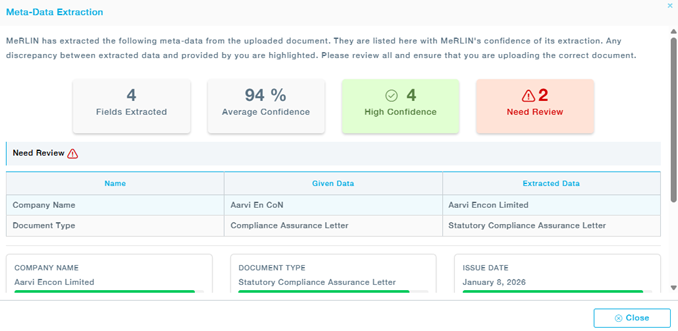 Note: Even when discrepancies are identified during AI-based metadata validation, suppliers are allowed to proceed with the upload. MeRLIN provides assisted insights only and does not restrict document submission. Click Proceed.